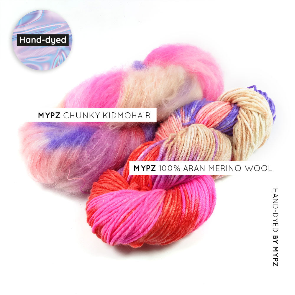 1 skein MYPZ Chunky Kidmohair DK & 1 skein MYPZ 100% Aran Merino Wool. Ordering this duo gives you a discount of €2,50 (normally €58,50).