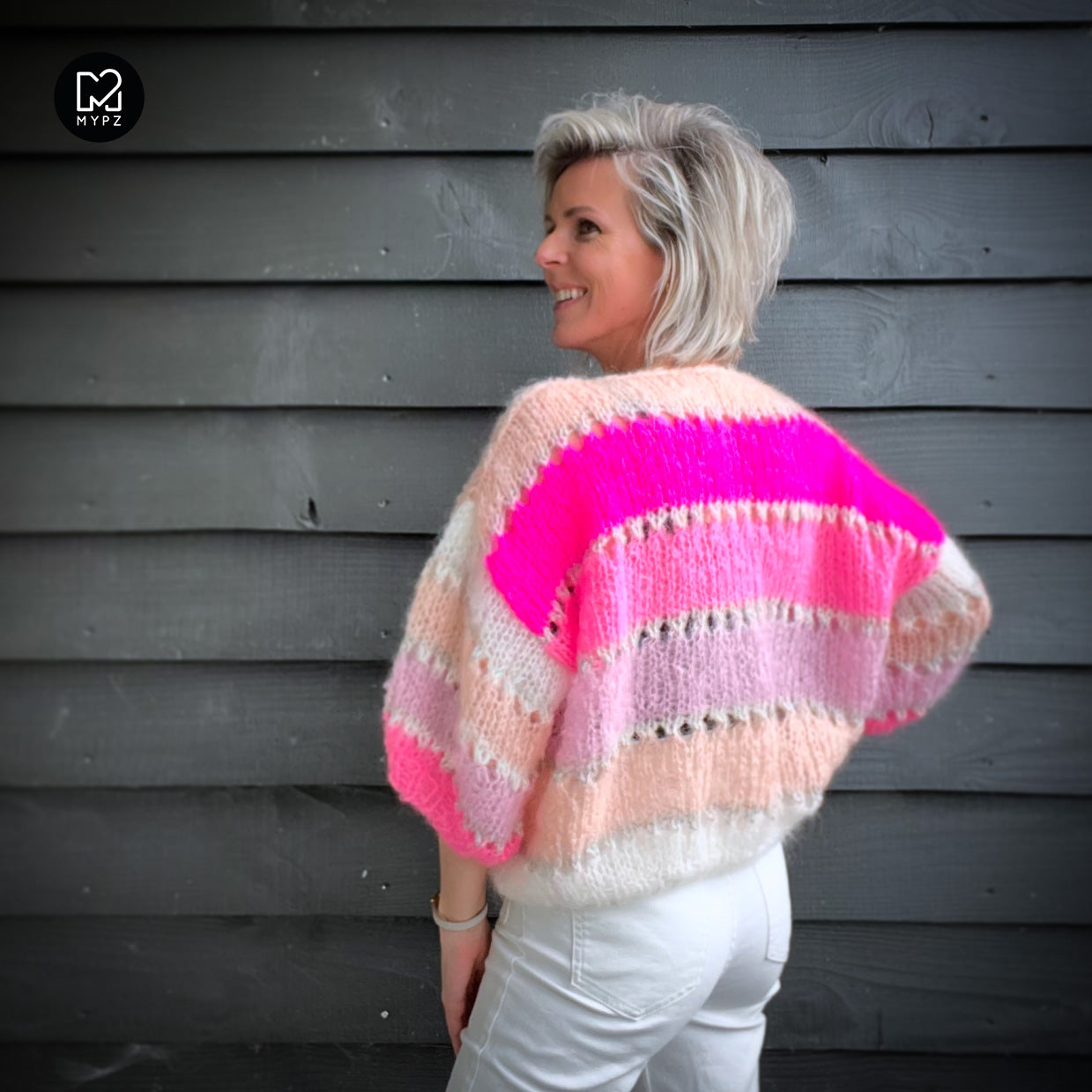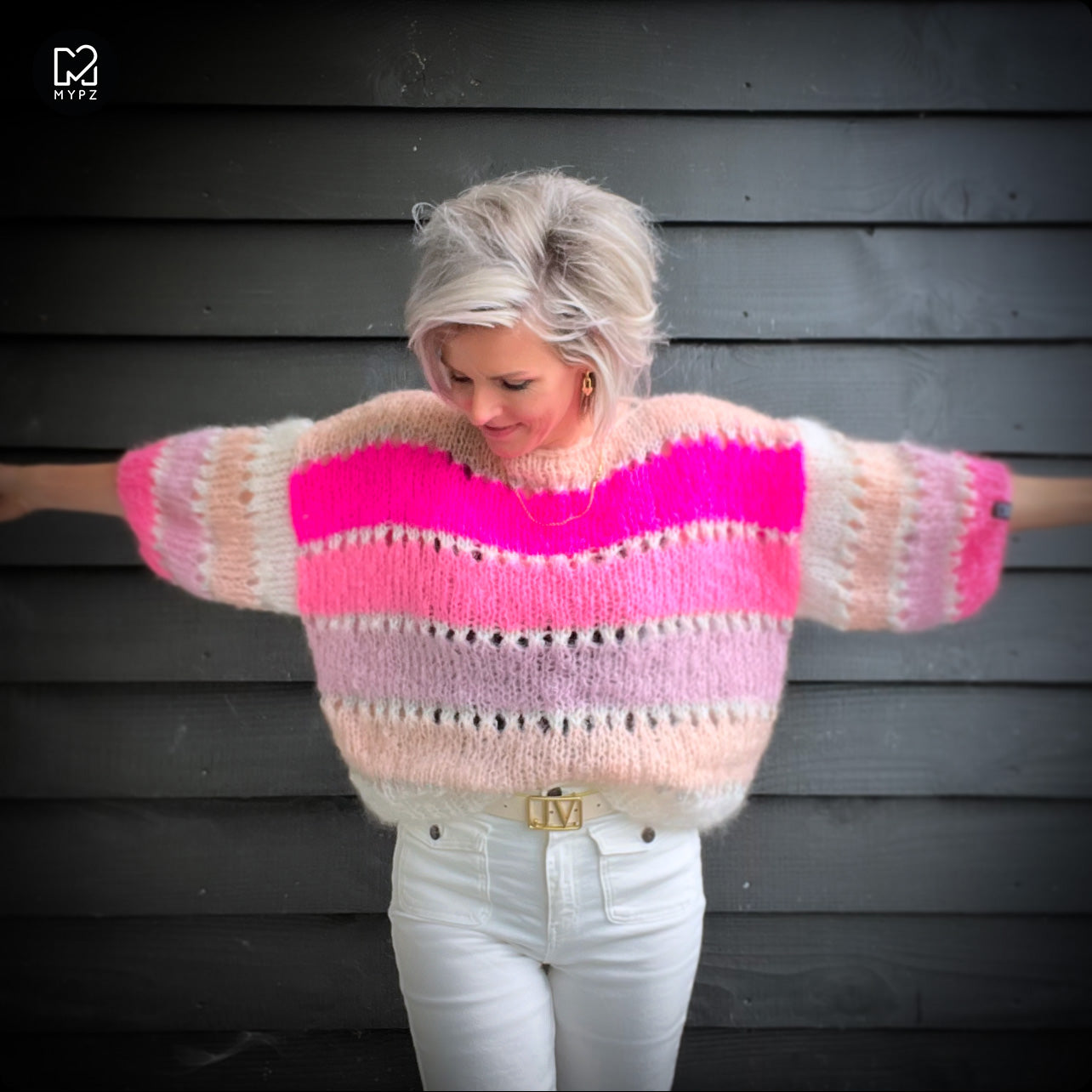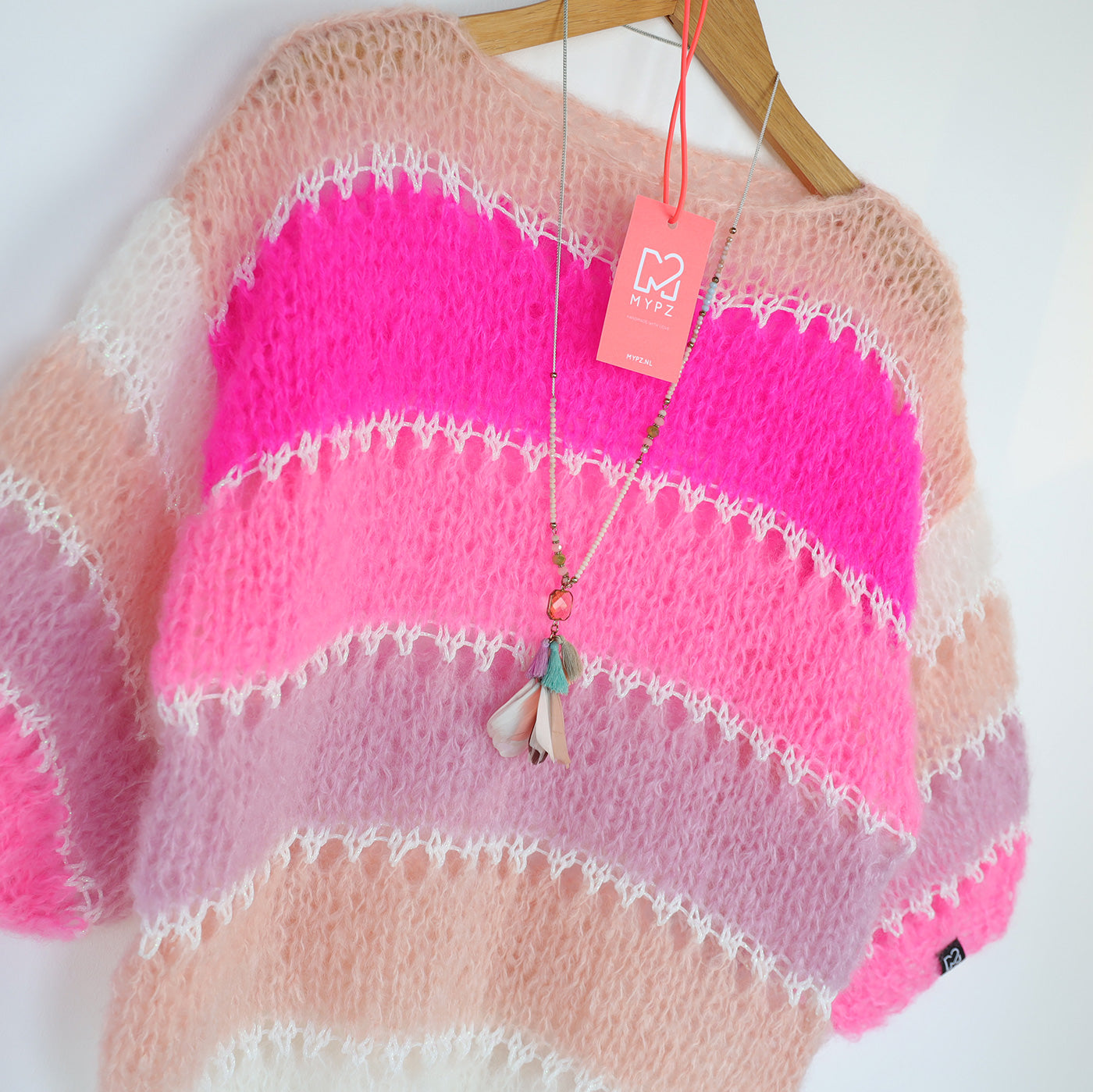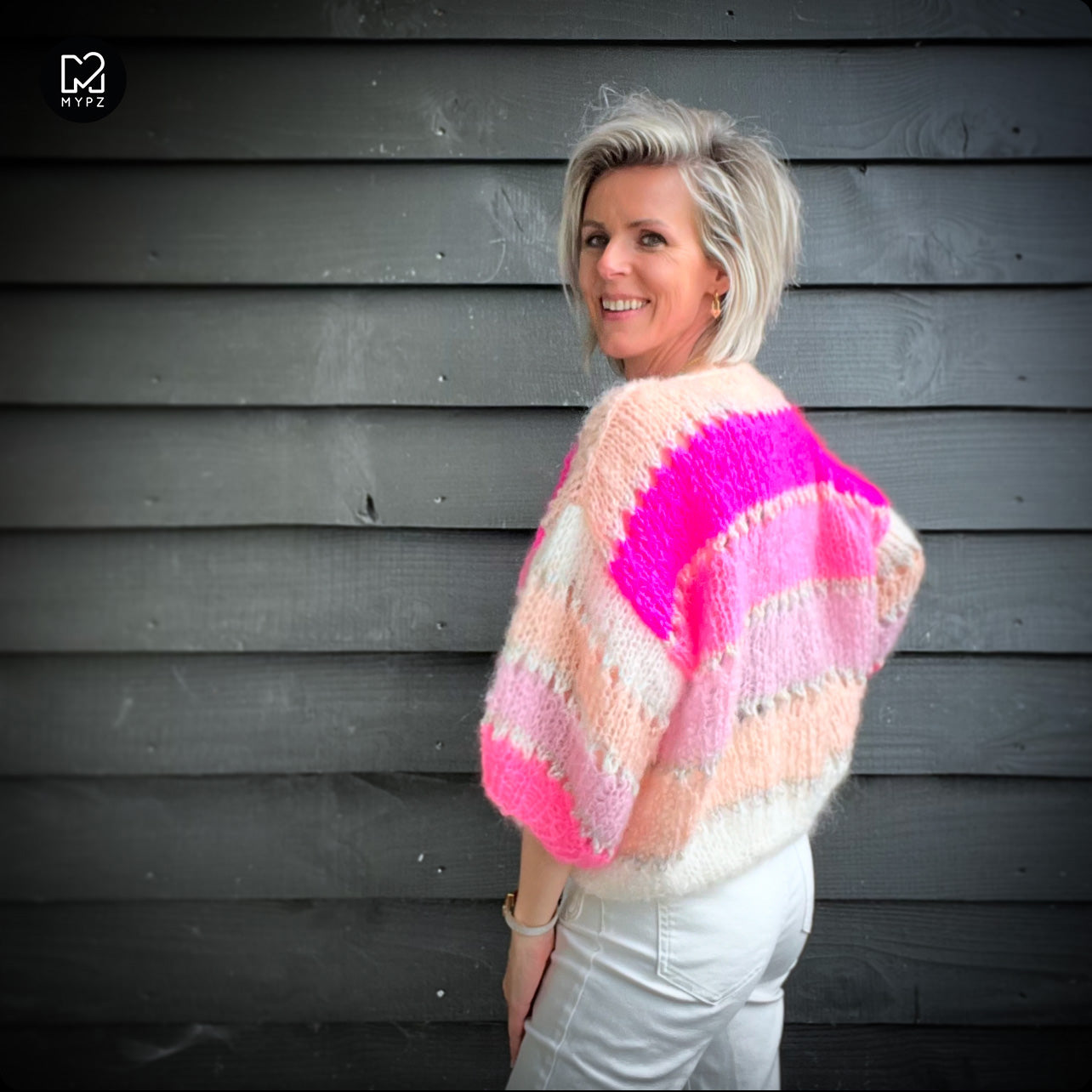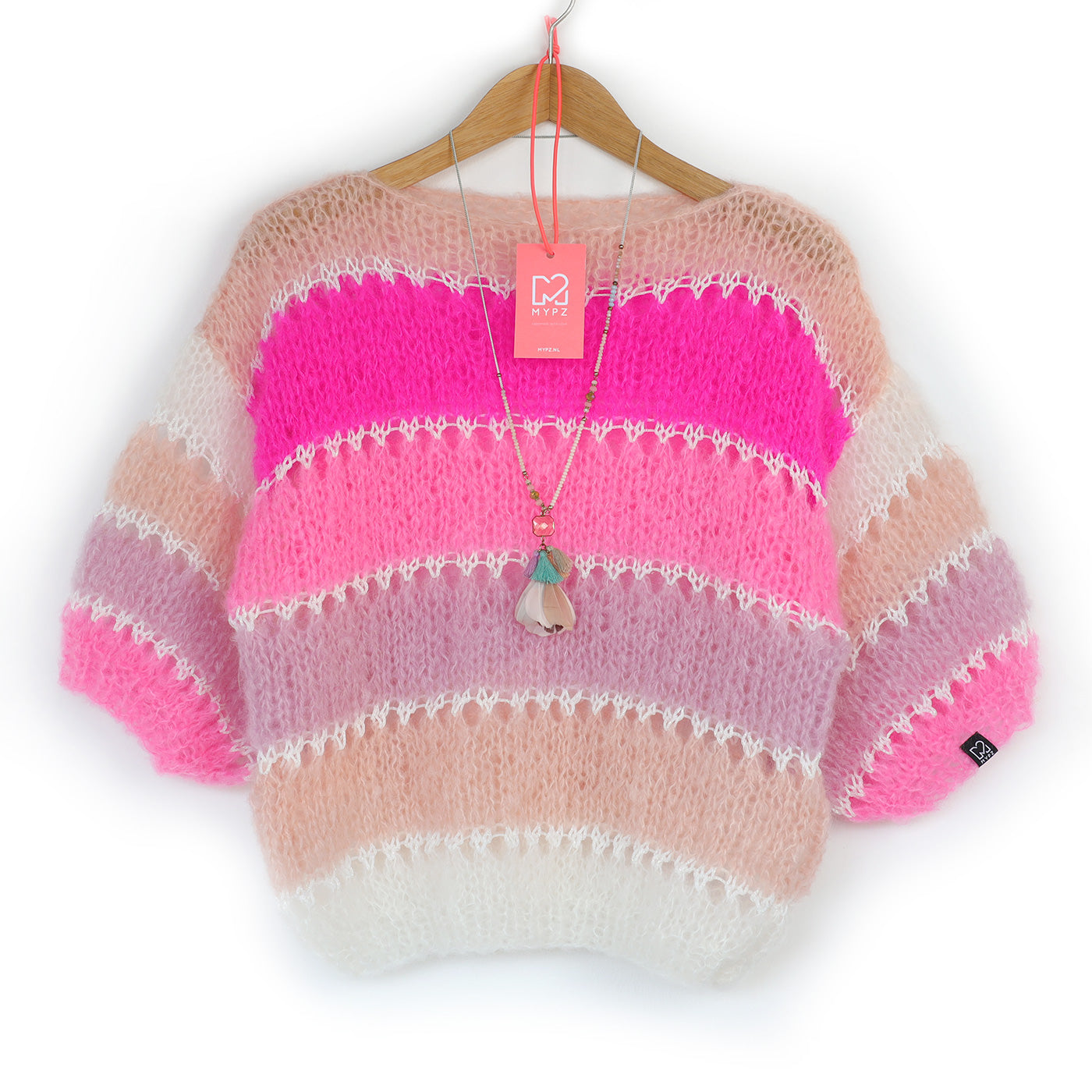 For this model you knit with 1 strand Mypz Chunky Kidmohair dk. We have used Durable Glam White for the striping.