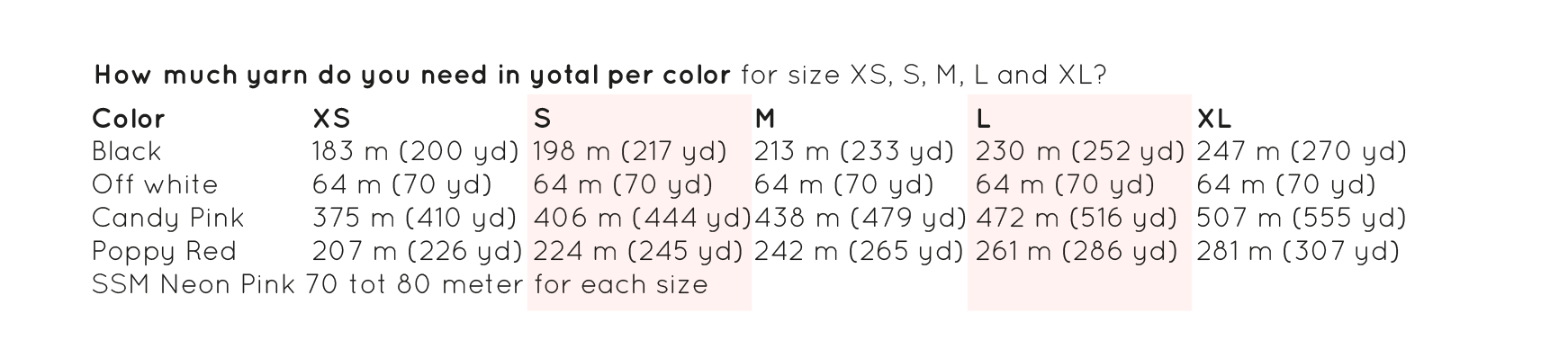 How much yarn do you need in total per color for size XS, S, M, L and XL?